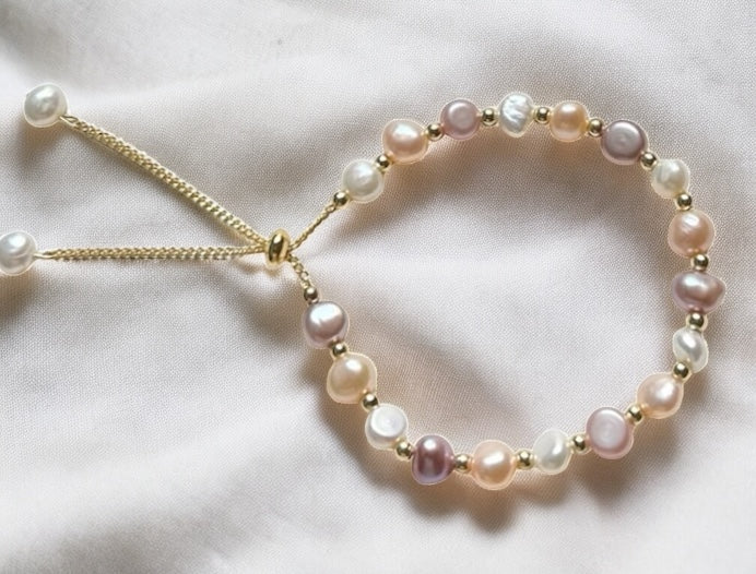 Elevate your style with our 7mm freshwater pearl bracelet, designed with a luxurious adjustable ball closure for a custom, all-day, comfortable fit. Hand-strung with luminous pearls in your choice of classic white, romantic pink, striking black & white, or vibrant mixed colours, each bracelet is a timeless expression of elegance.