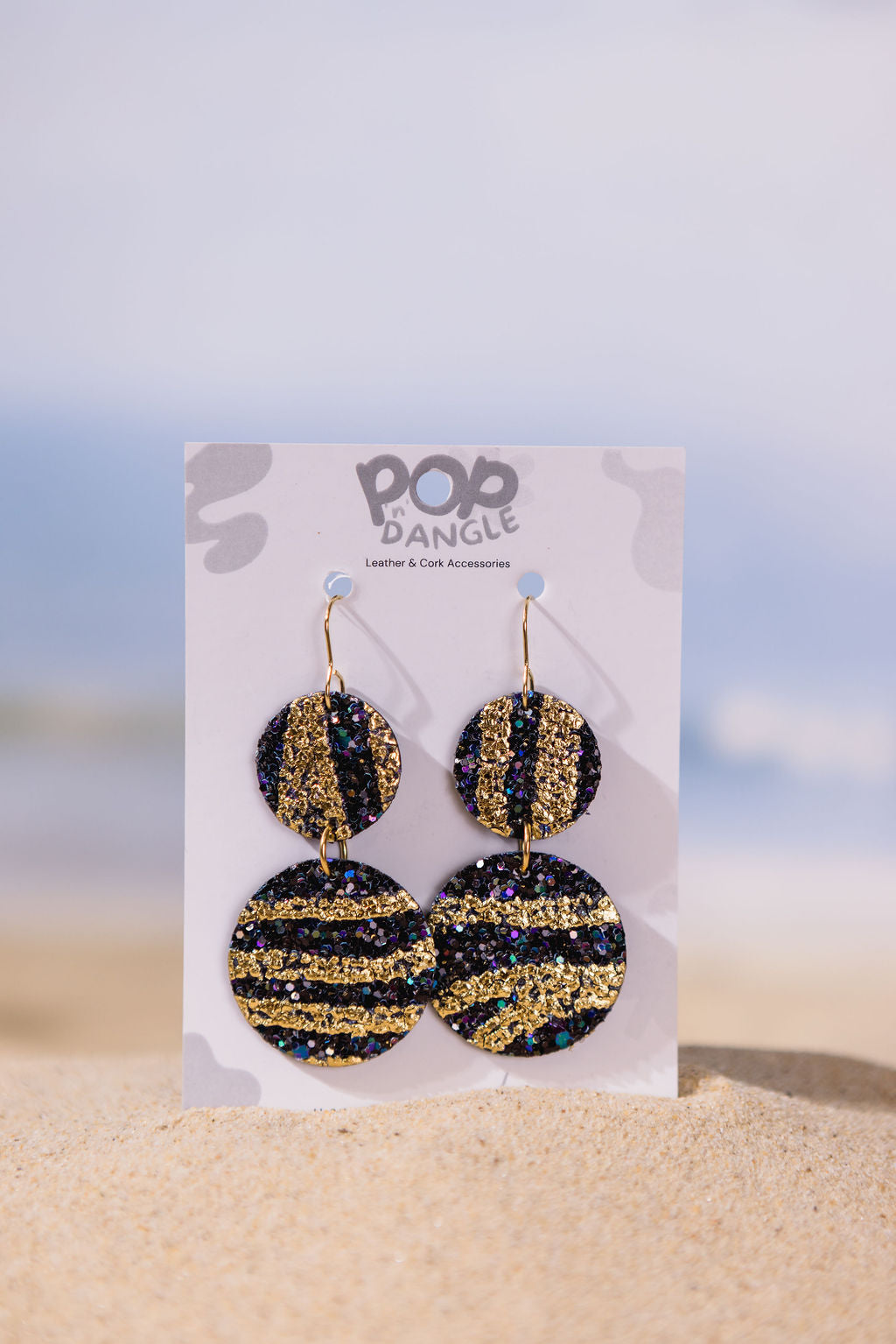 Turn heads with our Gold Tiger Sparkle Double Orbit Drops, the ultimate statement earrings for sparkle lovers. Featuring two stacked circular drops, these earrings shimmer with bold golden tiger-stripe glitter on canvas backed with soft leather. The layered design adds movement and dimension, making them the perfect choice for both day and night glam.