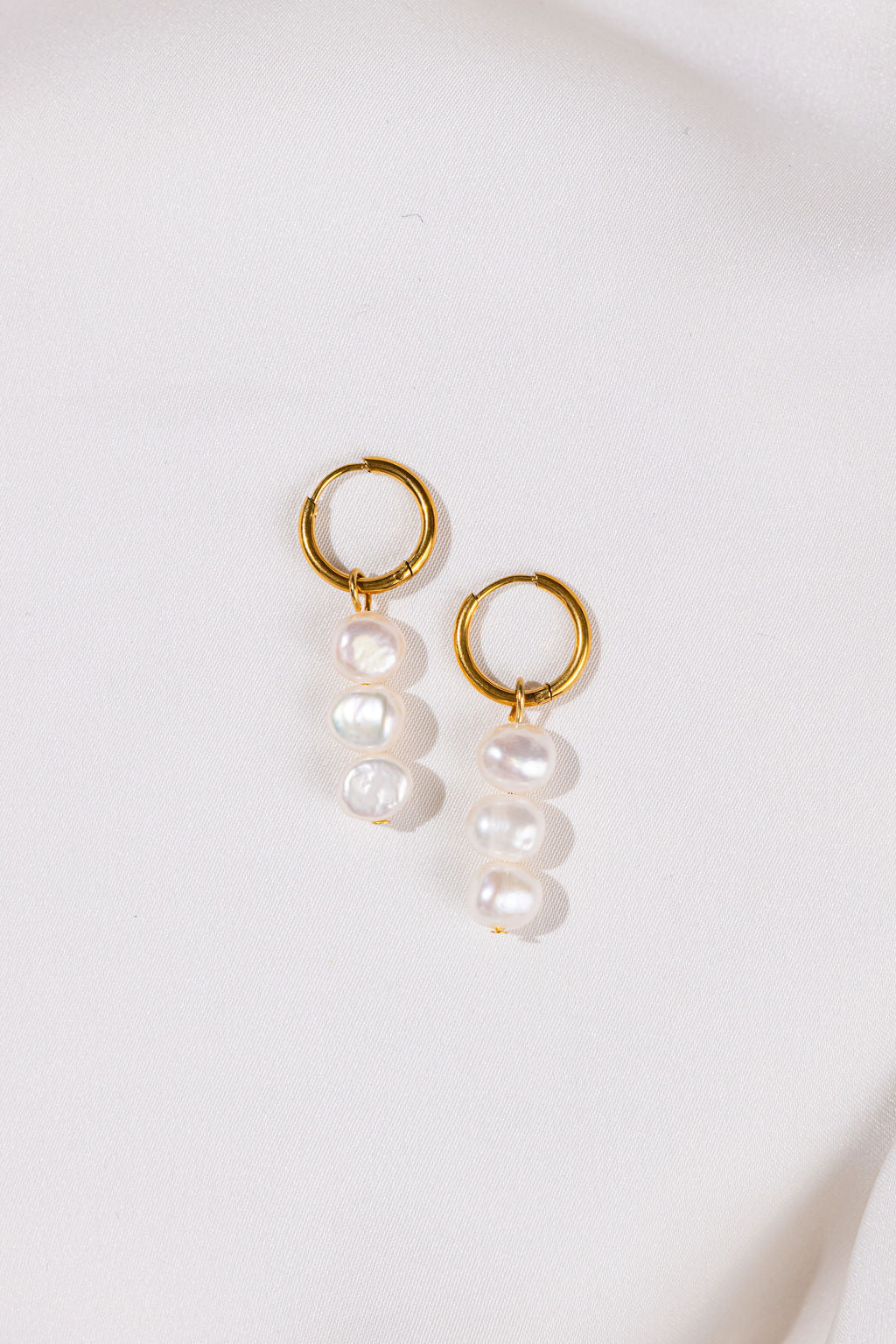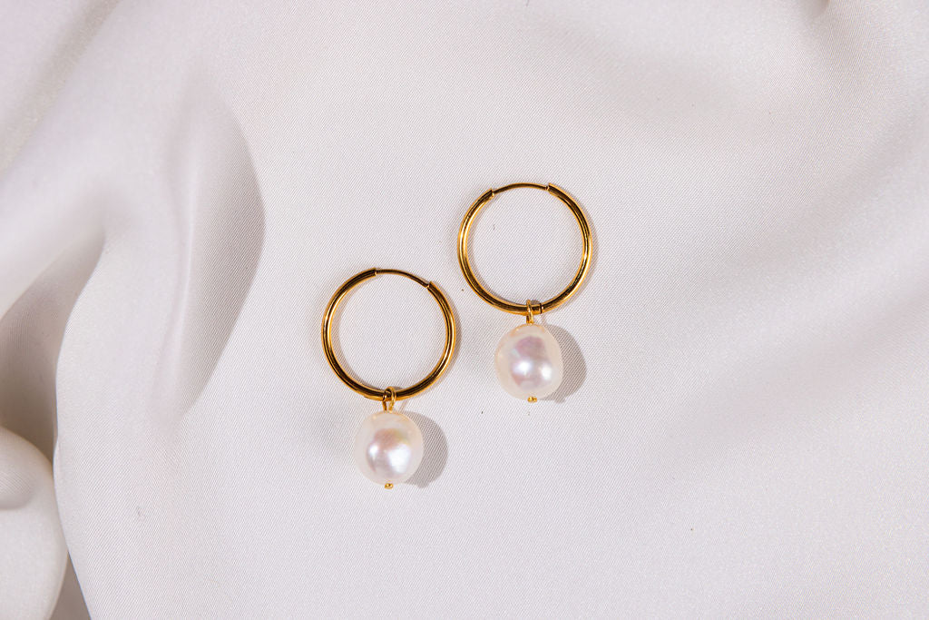 Add a warm, radiant glow to your jewelry collection with our gold hoops featuring freshwater pearls. These elegant earrings feature luminous white freshwater pearls, naturally unique in shape and size, delicately suspended from 8mm, 10mm, or 20mm gold-plated 316 stainless steel hoops.