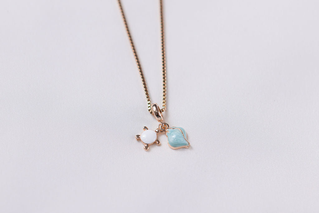 The Turtle & Shell Necklace brings together two ocean-inspired charms — a small turtle and a delicate seashell — symbolising protection, patience, and connection to the sea. Each charm is finely detailed and hangs from a stainless steel chain, available in gold or silver.